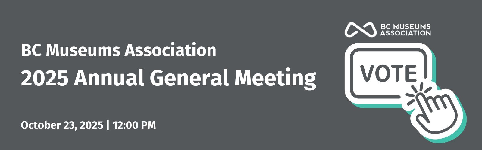 The Annual General Meeting of the BC Museums Association (BCMA) will take place on Thursday, October 23, 2025, at 12:00 PM.