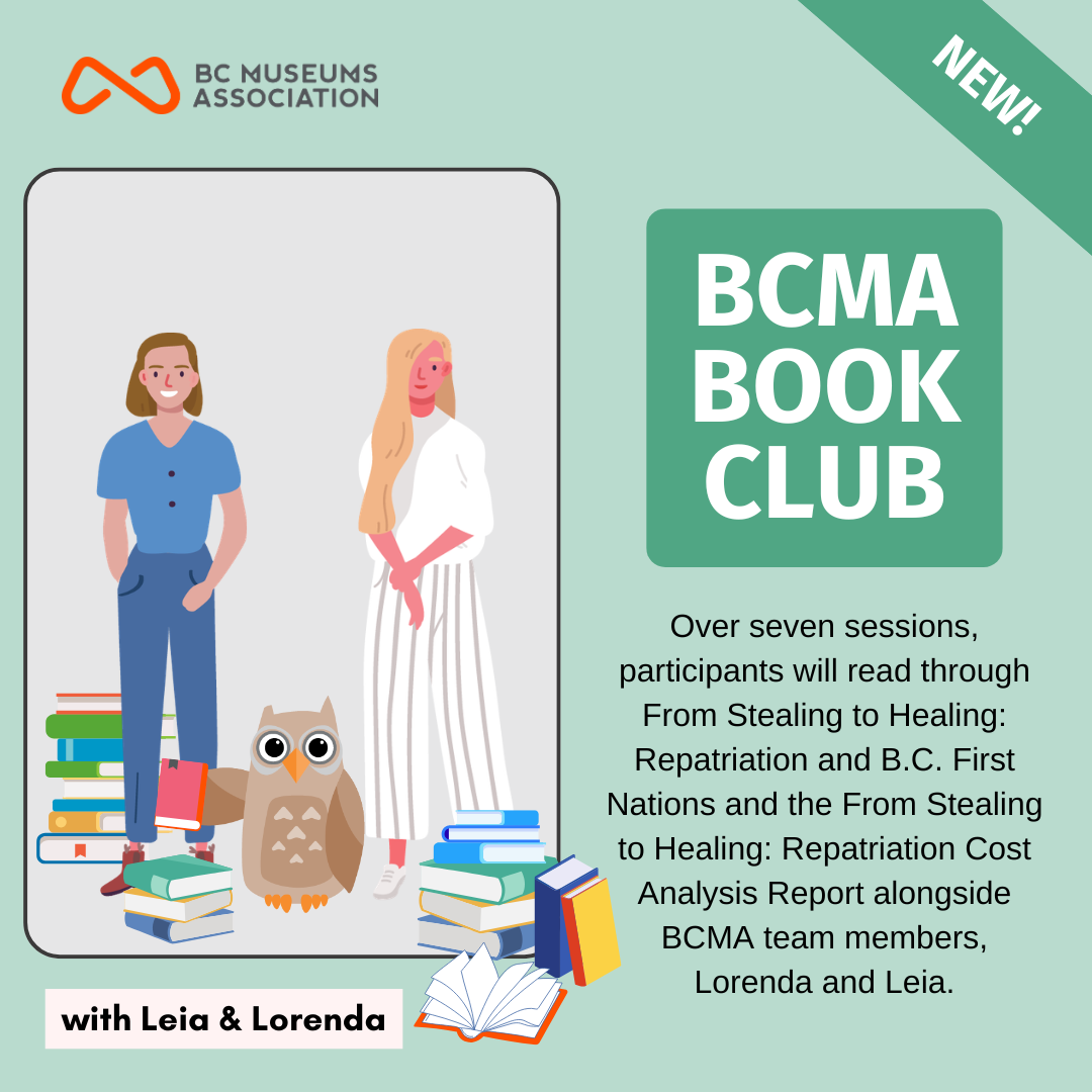 Over seven sessions, participants will read through From Stealing to Healing: Repatriation and B.C. First Nations and the From Stealing to Healing: Repatriation Cost Analysis Report alongside BCMA team members, Lorenda and Leia. The purpose of this series of online discussions is to support cultural heritage professionals’ decolonization efforts and to utilize existing resources. Education on topics and histories resulting from colonialism is critical if the sector is to move forward in reconciliation.
