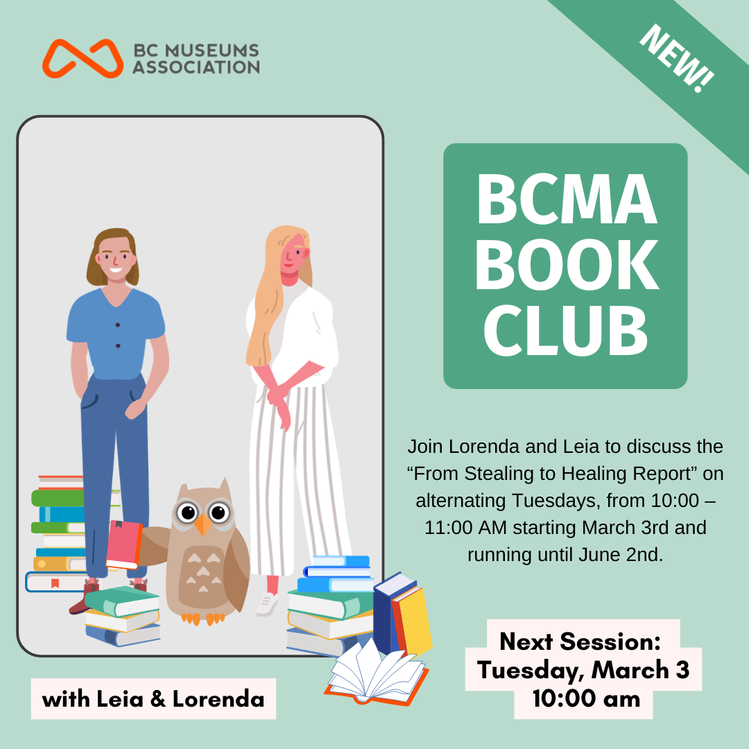 Over seven sessions, participants will read through From Stealing to Healing: Repatriation and B.C. First Nations and the From Stealing to Healing: Repatriation Cost Analysis Report alongside BCMA team members, Lorenda and Leia. The purpose of this series of online discussions is to support cultural heritage professionals’ decolonization efforts and to utilize existing resources. Education on topics and histories resulting from colonialism is critical if the sector is to move forward in reconciliation.